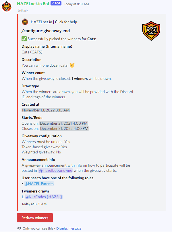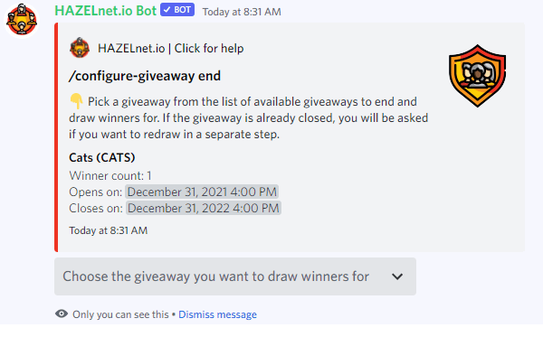 Once your giveaway end time is reached or you want to end an open giveaway, /configure-giveaway end lets you draw the winners and close a still-open giveaway for any further participation.