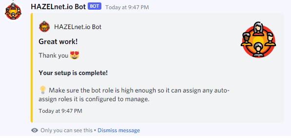 Once your settings are confirmed, click Finish setup to complete your installation - the bot is now ready.
