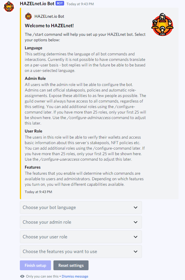 At any time after your bot is set up, you can rerun the /start command to reset your bot. Via the /configure-adminaccess add commands you can later add additional roles to your admins, should you need them.