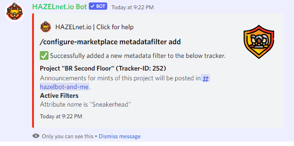 The /configure-marketplace metadatafilter add command enables you to fine tune your trackers to only post information about items that match specific metadata traits. You can have none, one or multiple filters active at the same time and combine them in powerful ways, to target exactly the specific set of items you would like to. You can use it to exclude certain traits, find 1/1s, or only track mints of the Green underwear items in your collection.