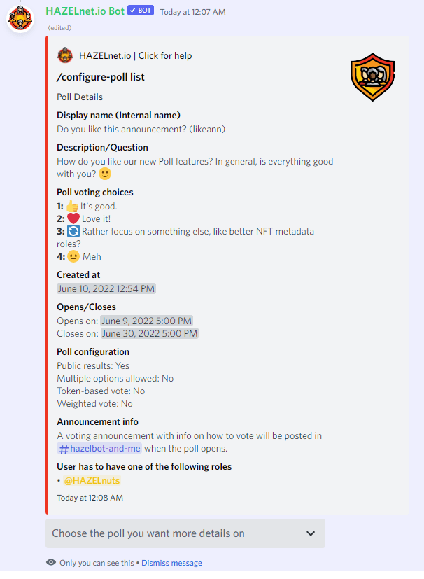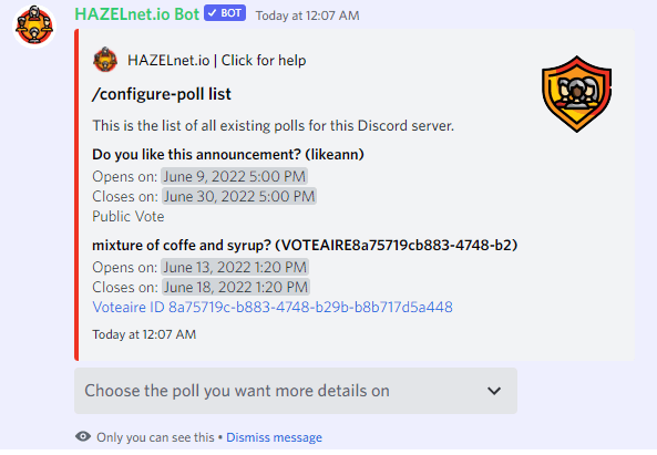 /configure-poll list gives quick access to all details about the running and closed polls on your server. When you run the command, you will see a list with polls and their opening and closing times. You can then select the poll your are interested in to see all details, as well as options and results by choosing it in the dropdown below.