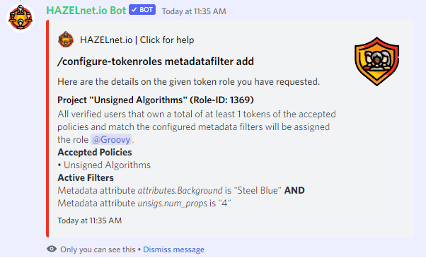 The /configure-tokenroles metadatafilter add command is possibly one of the most powerful commands in the arsenal of an NFT project. It enables you to assign roles based on individual traits of NFTs for all of your verified holders. You can have none, one or multiple filters active at the same time and combine them in powerful ways, to target exactly the population of your holders you would like to. You can use it to exclude certain traits, find 1/1s, or give a role to those that own the Green underwear NFTs.