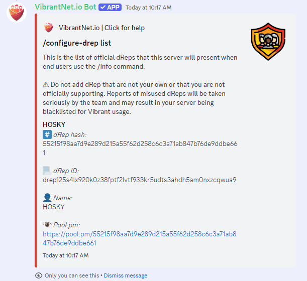 For Discords that represent a dRep or even just support certain dReps in the Cardano ecosystem, /configure-drep list can be used by administrators to get a list of all dReps that have been added to this server. Any dReps added via /confgure-drep add will be listed here. They will also be available for your normal users via the /info command.