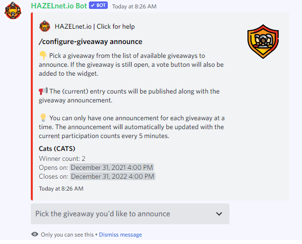 When you want to announce giveaways for which you have not scheduled an announcement at creation time, you must use /configure-giveaway announce. You need to provide the target channel in your Discord, to which the bot needs Send Messages permission. The bot will then post an announcement widget that includes the giveaway details, open and close times and participation counts.