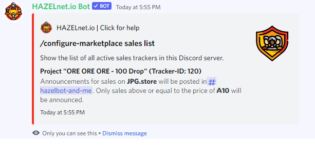With the helpful command /configure-marketplace sales list you can get a list of all sales trackers that are currently active on this server. All relevant details for each tracker, including minimum prices, marketplace, channel to which will be published and any added metadata filters (see /configure-marketplace metadatafilter add) can be seen for each item.